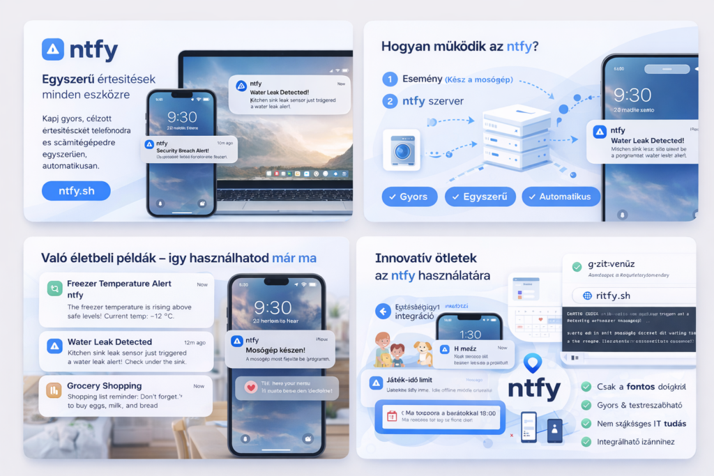 Az ntfy egy egyszerű, internetes értesítő rendszer. Segítségével az eszközeid (amik lehetnek telefonok, számítógépek vagy más okos kütyük) közvetlenül kaphatnak üzenetet, ha történik valami fontos. Fontos megemlíteni, hogy nem e-mailről van szó. Nem közösségi média értesítésről. Hanem célzott, rövid, gyors push üzenetekről, amelyek akkor érkeznek, amikor valami konkrét esemény történik — akár automatikusan, akár te küldöd el manuálisan.